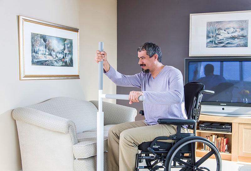 Support to go. Portable version can be moved and attached to floor plates which are installed in the floor. The support rail can then move to where you need it most… different rooms of your home or even the cottage!