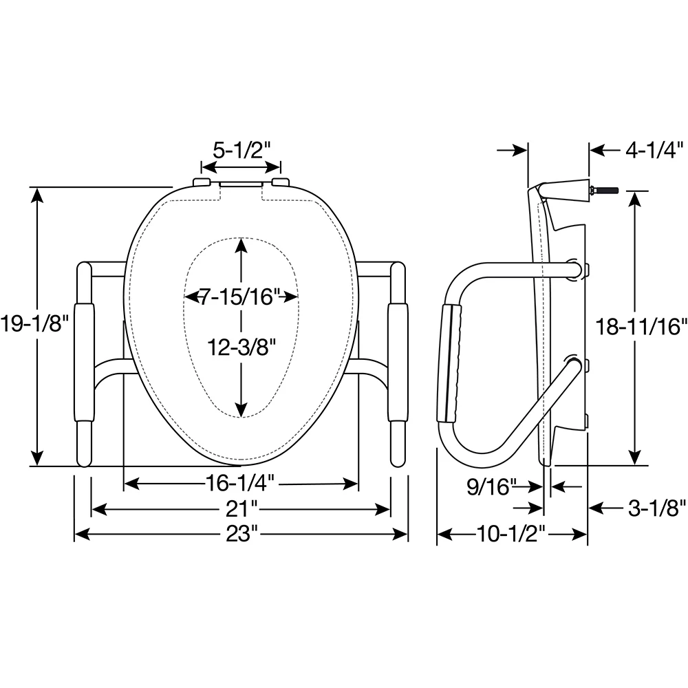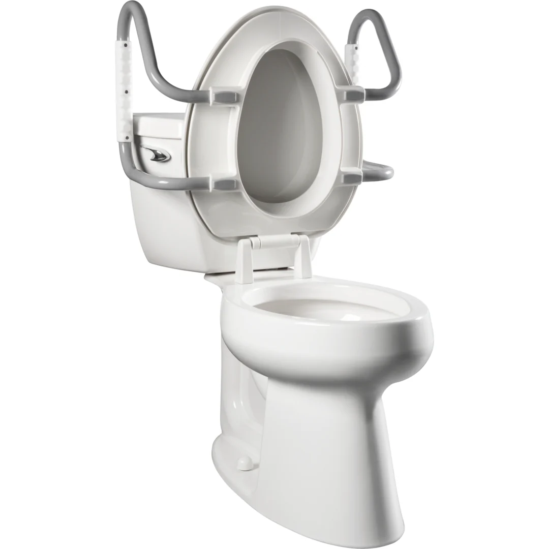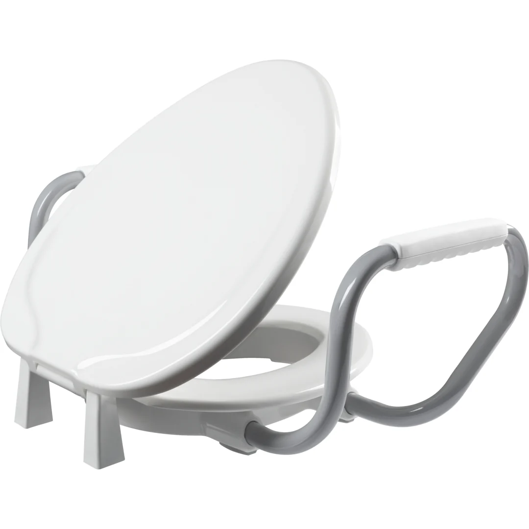 Arm width allows the seat ring to be raised in the upright position for easy cleaning and standing use of the toilet.