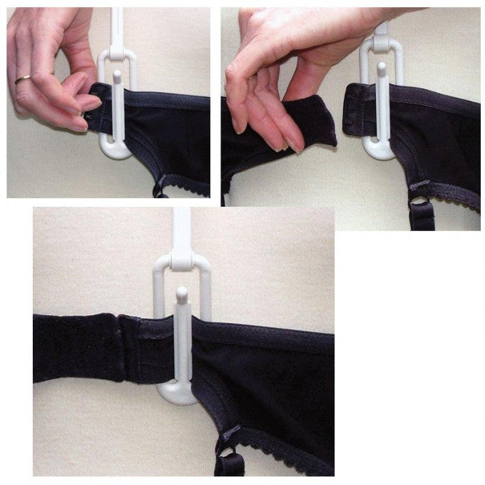Women of all ages with upper limb restrictions may find it difficult to put on a brassiere independently. The simple-to-use Bra-Angel holds one end of the brassiere securely while the other end is brought around the body. Especially useful for those with the use of only one arm. Works with most brassiere types and is easily adjusted for size. Its telescopic action allows it to be shortened for storage and traveling.