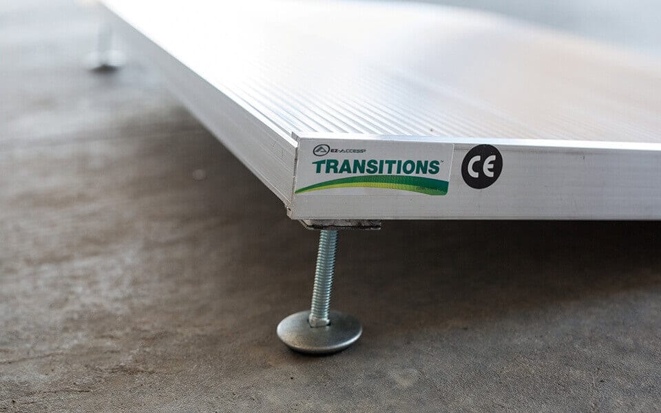 The adjustable legs with swivel feet of the Transitions Angled Entry Ramp allow for 2 inches of vertical adjustments. The adjustable legs adjust independently making the Angled Entry Ramp the perfect solution for uneven surfaces.