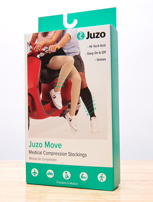 Juzo Move compression stockings slide on easily–designed with patented Slide Knit technology, and instep functional zone and larger heel. Juzo Move slips over the heel and ankle with ease, Microfibers help keep the skin cool and dry. Juzo Move stockings comfortably deliver medical compression all day.