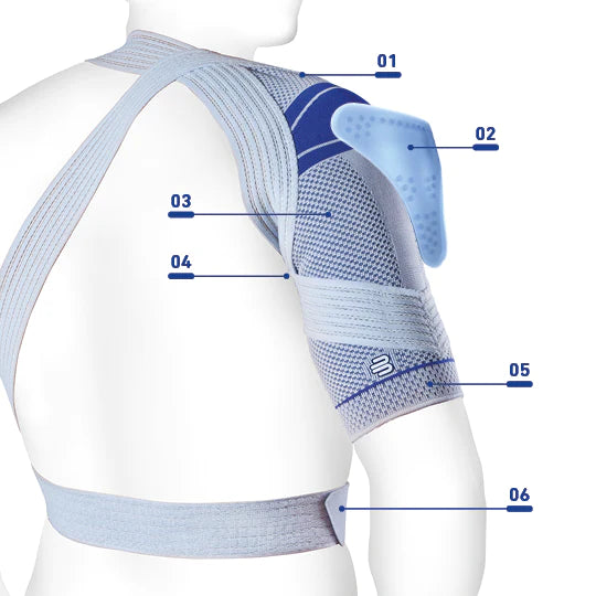 If the shoulder is weak, swollen, painful or recovering from a surgery, the OmoTrain® brace provides relief and stability for the shoulder. It relieves pain and protects the joint without limiting mobility. The shoulder muscles are activated and the joint benefits from improved stability. If required, an additional pressure cushion (pad) can produce a local massage effect on the soft tissues of the shoulder.