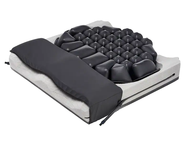 The Hybrid Elite Dual Compartment cushion combines the unique properties of ROHO air cells with the supportive features of foam. With two independent, adjustable air compartments within the pelvic area, set the inflation levels to the shape and ideal position. Contoured foam channels provide positioning and stability.