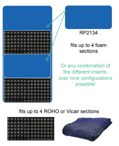 Option 4: fits up to 4 ROHO or Vicair sections and 2 x RP2134 (Foam leveling pad 21″ x 34″) fits up to 4 foam sections or any combination of the different inserts, over nine configurations are possible.