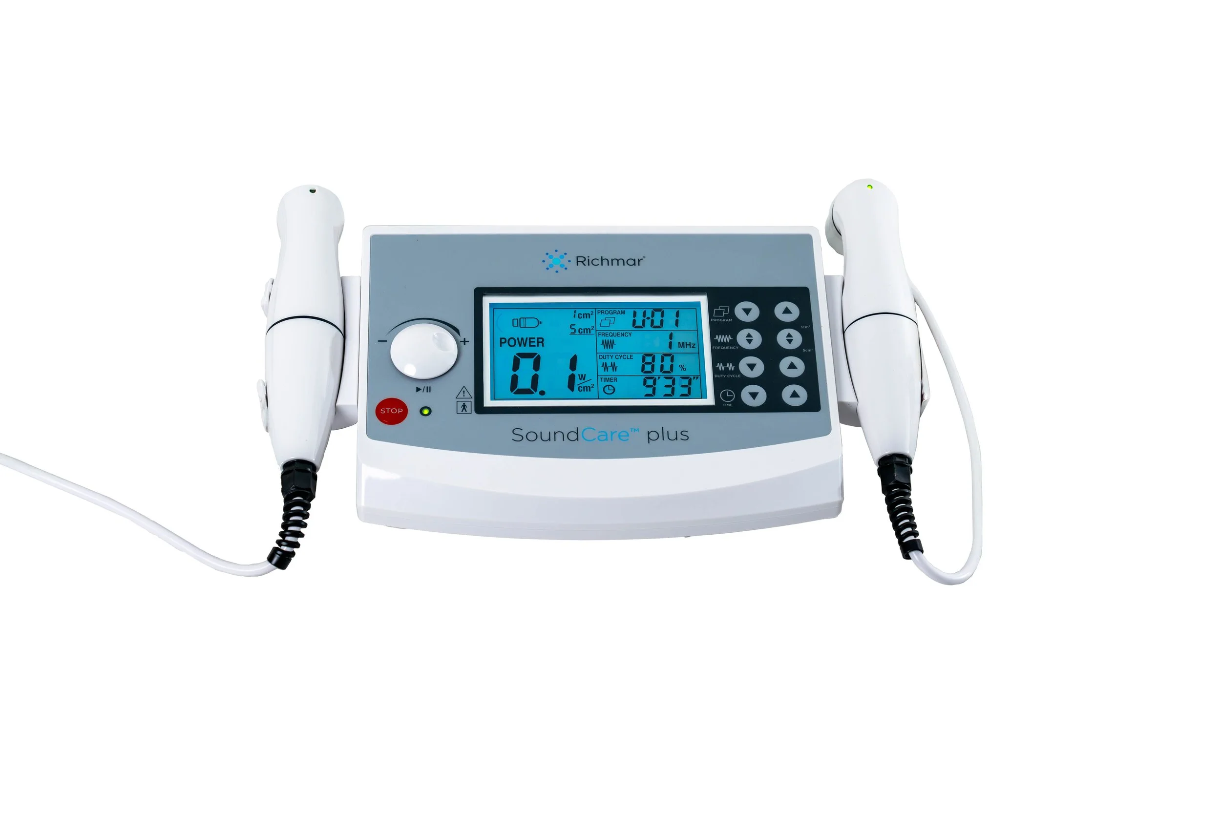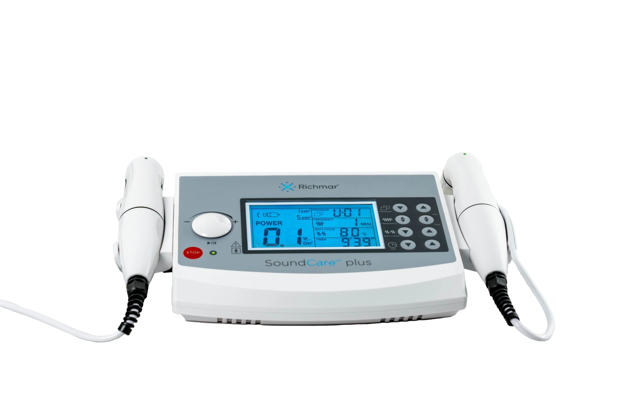 The SoundCare Plus is a professional ultrasound device, designed by clinicians. With this unique design, the SoundCare Plus comes equipped with two applicators, 1cm² and 5cm², that are plugged into the device allowing the user to switch between applicators with a single button push.The SoundCare Plus has 20 presets and operates in 1 MHz and 3 MHz frequencies. The portable design lets you take it to your patient or keep it at the clinic. It’s easy to use, and up and running within minutes.