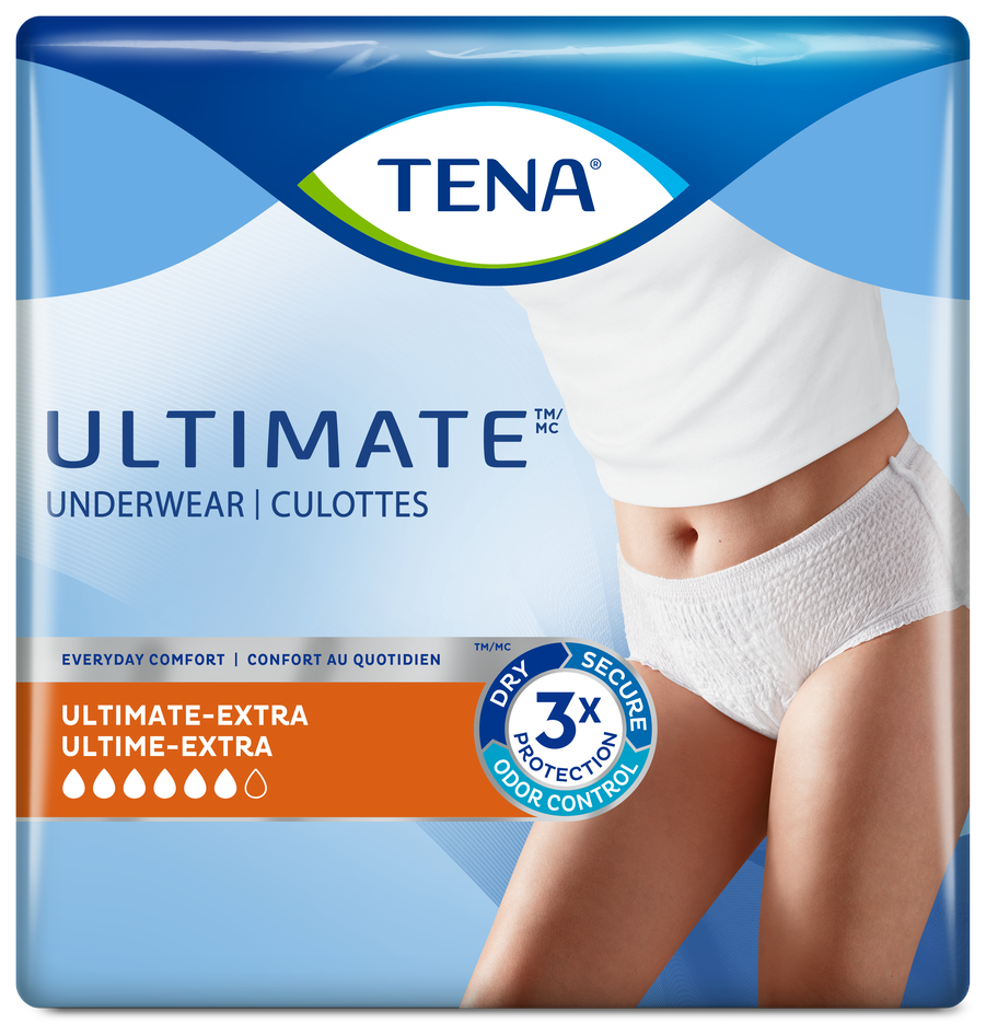 TENA Ultimate Underwear is designed to protect against heavy urine leakage while remaining comfortable and discreet. It has a stronger more absorbent core, improved leg gathers to protect against leakage, and softer and more comfortable against your skin. TENA Ultimate Underwear provides triple protection against leaks, odour, and wetness.